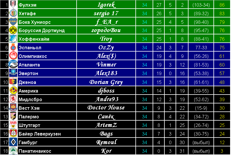 Турнирная Таблица Июль - 2009