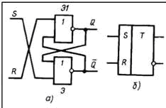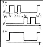 | 11. Нетактируемый и тактируемый потенциалом RS-триггеры. 2.1. Структуры триггеров RS-триггер на элементах ИЛИ-НЕ (рис. 2,а). Прежде всего рассмотрим воздействие на такой триггер комбинаций сигналов S=1, R=1 и S=0, R=0. Сочетание S=1, R=1 является запрещенным, так как при нем на обоих выходах триггера устанавливаются логические 0 и после снятия входных сигналов состояние его непредсказуемо. Для элемента ИЛИ-НЕ логический 0 является пассивным сигналом: с его поступлением на вход состояние выхода элемента не изменяется. Поэтому появление комбинации S=0, R=0 не изменяет состояния триггера. Логическая 1 для элемента ИЛИ-НЕ является активным сигналом: наличие ее на входе элемента однозначно определяет на его выходе логический 0 вне зависимости от сигнала на другом входе. Отсюда следует, что переключающим сигналом для рассматриваемого триггера является логическая 1, а также то, что вход S (установки триггера в состояние Q=1) должен быть связан с элементом, выход которого принят за . Из сказанного ясно, что для переключения триггера в состояние Q=1 на его входы следует подать комбинацию S=1, R=0, а для переключения в состояние Q=0 — комбинацию S=0,R=1. Пусть триггер (рис. 2,а) находится в состоянии 0 (Q=0, =1), а на входах действуют сигналы S=0, R=0. Для его переключения в состояние Q=1 подадим на входы комбинацию о S=1, R=0. Тогда на выходе элемента Э2 установится логический 0, на входах элемента Э1 будут одновременно присутствовать, логические 0, и на выходе Q установится логическая 1 — триггер переключается в новое состояние (Q=1, =0). Для его переключения из этого состояния на входы должна поступить комбинация S=0, R=1. После этого на выходе Q будет логический 0, на входах элемента Э2 одновременно окажутся логические 0 и его выход примет потенциал, соответствующий =1, —триггер переключается в состояние Q=0, =1. Рис.3. Из изложенного следует, что время переключения триггера (tпер) равно удвоенному времени переключения логического элемента (удвоенному времени задержки — 2tз). Часто, предусматривая запас, принимают tпер=3tз. Для надежного переключения триггера длительность входного переключающего сигнала не должна быть меньше tпер. Условное изображение RS-триггера приведено на рис. 2,б. На рис.3 приведена идеализированная временная диаграмма RS-триггера, на которой время переключения триггера принято равным нулю. Предполагается, что до момента t1 S=0, R=0, а триггер находится в состоянии Q=0. В момент t1 комбинация S=1, R=0 переключает триггер в состояние Q=1. При t=t2 на входах устанавливается сочетание S=0, R=0, при котором состояние триггера сохраняется прежним. Комбинация S=1, R=0, появляющаяся в момент t3, и комбинация S=0, R=0 в момент t4 никаких изменений не вносят, по-прежнему Q=1. Только в момент t5 сочетание S=0, R=1 вызывает переключение триггера в состояние Q=0. Вслед за этим изменение логической переменной на входе R состояния триггера не меняет. Новое переключение происходит в момент t6 при поступлении на входы комбинации S=1, R=0. Заметим, что запрещенное сочетание сигналов S=1, R=1 на диаграмме отсутствует. RS -триггер на элементах И-НЕ (рис. 4,а). Для элемента И-НЕ активным сигналом является логический 0: наличие его хотя бы на одном входе обусловливает на выходе логическую 1 независимо от сигналов на других входах. Логическая 1 для такого элемента является пассивным сигналом: с ее поступлением на вход состояние выхода элемента не и