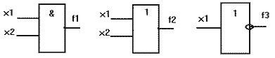 | 2. Булевы функции двух переменных. Условные графические обозначения логических элементов, реализующих эти функции. Бу́лева фу́нкция (или логи́ческая функция, или функция а́лгебры ло́гики) от n переменных — в дискретной математике отображение Bn → B, где B = {0,1} — булево множество. Элементы булева множества 1 и 0 обычно интерпретируют как логические значения «истинно» и «ложно», хотя в общем случае они рассматриваются как формальные символы, не несущие определенного смысла. Неотрицательное целое число n называют арностью или местностью функции, в случае n = 0 булева функция превращается в булеву константу. Элементы декартова произведения Bn называют булевыми векторами. Множество всех булевых функций от любого числа переменных часто обозначается P2, а от n переменных — P2(n). Булевы функции названы так по фамилии математика Джорджа Буля. Основные сведения Каждая булева функция арности n полностью определяется заданием своих значений на своей области определения, то есть на всех булевых векторах длины n. Число таких векторов равно 2n. Поскольку на каждом векторе булева функция может принимать значение либо 0, либо 1, то количество всех n-арных булевых функций равно 22n. Поэтому в этом разделе рассматриваются только простейшие и важнейшие булевы функции. То, что каждая булева функция задаётся конечным массивом данных, позволяет представлять их в виде таблиц. Такие таблицы носят название таблиц истинности и в общем случае имеют вид:x1 x2 … xn f(x1,x2,…,xn) 0 0 … 0 f(0,0,…,0) 1 0 … 0 f(1,0,…,0) 0 1 … 0 f(0,1,…,0) 1 1 … 0 f(1,1,…,0) 0 1 … 1 f(0,1,…,1) 1 1 … 1 f(1,1,…,1) Практически все булевы функции малых арностей (0, 1, 2 и 3) сложились исторически и имеют конкретные имена. Если значение функции не зависит от одной из переменных (то есть строго говоря для любых двух булевых векторов, отличающихся лишь в значении этой переменной, значение функции на них совпадает), то эта переменная называется фиктивной. Нульарные функции При n = 0 количество булевых функций сводится к двум 220 = 21 = 2, первая из них тождественно равна 0, а вторая 1. Их называют булевыми константами — тождественный нуль и тождественная единица. [править] Унарные функции При n = 1 число булевых функций равно 221 = 22 = 4. Определение этих функций содержится в следующей таблице. Таблица значений булевых функций от одной переменной:x 0 x̅ x 1 0 0 1 0 1 1 0 0 1 1 Названия булевых функций от одной переменной:Обозначение Название 0 тождественный ноль, тождественная ложь, тождественное "НЕТ" x̅, ¬x, x' отрицание, логическое "НЕТ", "НЕ", "НИ", "NOT"(англ.), "NO"(англ.) x тождественная функция, логическое "ДА", "YES"(англ.) 1 тождественная единица, тождественная истина, тождественное "ДА", тавтология [править] Бинарные функции При n = 2 число булевых функций равно 22² = 24 = 16.