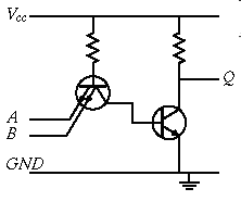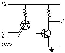 | Логический элемент 3И-НЕ в серии микросхем 74LS(К555)[1] ТТЛ-логика (как и ТТЛШ) является прямым наследником ДТЛ и использует тот же принцип действия. Входной ТТЛ-транзистор (в отличие от обычного) имеет несколько, обычно от 2 до 8, эмиттеров. Эти эмиттеры выполняют роль входных диодов (если сравнивать с ДТЛ). Многоэмиттерный транзистор по сравнению с применявшейся в схемах ДТЛ сборкой из отдельных диодов занимает меньше места на кристалле и обеспечивает более высокое быстродействие. Следует отметить, что в микросхемах ТТЛШ, начиная с серии 74LS, вместо многэмиттерного транзистора используется сборка диодов Шоттки (серия 74LS) или PNP транзисторы в сочетании с диодами Шоттки (серии 74AS, 74ALS), так что фактически произошёл возврат к ДТЛ. Название ТТЛ заслуженно носят лишь серии 74, 74H, 74L, 74S, содержащие многоэмиттерный транзистор. Все более поздние серии многоэмиттерного транзистора не содержат, фактически являются ДТЛ и носят название ТТЛШ (ТТЛ Шоттки) лишь «по традиции», будучи развитием именно ДТЛ. Транзисторно-транзисторная логика с диодами Шоттки (ТТЛШ) В ТТЛШ используются транзисторы Шоттки, в которых барьер Шоттки не позволяет транзистору войти в режим насыщения в результате чего диффузионная ёмкость мала и задержки переключения малы, а быстродействие высокое. ТТЛШ-логика отличается от ТТЛ наличием диодов Шоттки в цепях база — коллектор, что исключает насыщение транзистора, а также наличием демпфирующих диодов Шоттки на входах (редко на выходах) для подавления импульсных помех, образующихся из-за отражений в длинных линиях связи (длинной считается линия, время распространения сигнала в которой больше длительности его фронта, для самых быстрых ТТЛШ микросхем линия становится длинной начиная с длины в несколько сантиметров). Серии ТТЛ-микросхем отечественного производства 106 — ранняя серия ТТЛ микросхем, пониженной степени интеграции (не более 2 логических элементов в одном корпусе), предназначенная для тяжёлых условий эксплуатации (военная аппаратура, космос, и т. п.). Не имеет аналогов среди микросхем фирмы Texas Instruments. 133 и 155 соответствуют сериям 54 и 74; 130, 131 — сериям 54H и 74H; 134, КР134 — сериям 54L и 74L; 136 и 158 — близки к сериям 54L и 74L, но имеют вдвое большее энергопотребление при несколько большем быстродействии; 530 и 531 — сериям 54S и 74S; 533 и 555 — сериям 54LS и 74LS; 1530 — серии 74AS (приблизительное соответствие); 1531 — серии 74F; 1533 — серии 74ALS;