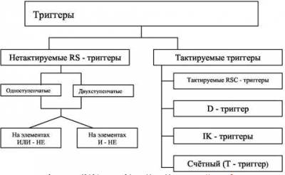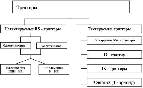 | 10. Триггеры нетактируемые и тактируемые. Примеры построения. Отличительные признаки. Триггеры реклама в интернет Страница: 1/3 1. Общие сведения Устройство, имеющее два устойчивых состояния, называют триггером. Он имеет два выхода, один из них называют прямым, а другой — инверсным. Потенциалы на них взаимно инвертированы: лог. 1 на одном выходе соответствует лог. 0 на другом. С приходом переключающих (запускающих) сигналов переход триггера из одного состояния в другое происходит лавинообразно, и потенциалы на выходах меняются на противоположные. В интервале между переключающими сигналами состояние триггера не меняется, т. е. триггер "запоминает" поступление сигналов, отражая это величиной потенциала на выходе. Это дает возможность использовать его как элемент памяти. При лавинообразных переключениях на выходе триггера формируются прямоугольные импульсы с крутыми фронтами. Это позволяет использовать триггер для формирования прямоугольных импульсов из напряжения другой формы (например, из синусоидального). При двух последовательных переключениях триггера на выходе формируется один импульс, т.е. триггер можно использовать как делитель частоты переключающих сигналов с коэффициентом, равным двум. Триггеры можно разделить на не тактируемые и тактируемые. Не тактируемый (асинхронный) триггер может менять свое состояние Рис.1 переключающими сигналами в любое время. Тактируемый (синхронный) триггер переключается синхронно с поступлением специального тактирующего импульса. Эти и другие типы триггеров, показанные в таблице классификации, подробно рассмотрены далее. Промышленность выпускает разнообразные типы триггеров в интегральном исполнении. Кроме того, они могут быть выполнены на цифровых интегральных микросхемах, операционных усилителях и на транзисторах. Рис.1. 2. Не тактируемые триггеры На выходе элемента И-НЕ (ИЛИ-НЕ) имеется инвертор (усилитель). В структуре из двух таких элементов можно обеспечить положительную обратную связь, если вход одного элемента соединить с выходом другого, и баланс амплитуд. Такой структурой является RS-триггер. Он имеет два выхода: прямой () и инверсный () и два входа: S — установки прямого выхода в 1 (говорят: "установки триггера в 1") и R — установки триггера в 0. Такой триггер является асинхронным RS-триггером. Он применяется самостоятельно, а также в качестве запоминающей ячейки входит в состав более сложных интегральных триггеров.