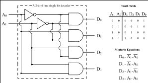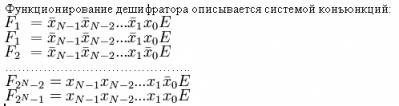 | 4. Дешифраторы. Минимизация двоично-десятичных дешифраторов. У этого термина существуют и другие значения, см. Дешифратор (значения). Пример дешифратора 2×4 Дешифратор (декодер) — комбинационное устройство, преобразующее n-разрядный двоичный, троичный или k-ичный код в -ичный одноединичный код, где - основание системы счисления. Логический сигнал появляется на том выходе, порядковый номер которого соответствует двоичному, троичному или k-ичному коду. Дешифраторы являются устройствами, выполняющими двоичные, троичные или k-ичные логические функции (операции). Двоичный дешифратор работает по следующему принципу: пусть дешифратор имеет N входов, на них подано двоичное слово xN − 1xN − 2...x0, тогда на выходе будем иметь такой код, разрядности меньшей или равной 2N, что разряд, номер которого равен входному слову, принимает значение единицы, все остальные разряды равны нулю. Очевидно, что максимально возможная разрядность выходного слова равна 2N. Такой дешифратор называется полным. Если часть входных наборов не используется, то число выходов меньше 2N, и дешифратор является неполным. Часто дешифраторы дополняются входом разрешения работы E. Если на этот вход поступает единица, то дешифратор функционирует, в ином случае на выходе дешифратора вырабатывается логический ноль вне зависимости от входных сигналов. Существуют дешифраторы с инверсными выходами, у такого дешифратора выбранный разряд показан нулём. Функционирование дешифратора описывается системой конъюнкций: Обратное преобразование осуществляет шифратор. Дешифраторы. Это комбинационные схемы с несколькими входами и выходами, преобразующие код, подаваемый на входы в сигнал на одном из выходов. На выходе дешифратора появляется логическая единица, на остальных — логические нули, когда на входных шинах устанавливается двоичный код определённого числа или символа, то есть дешифратор расшифровывает число в двоичном, троичном или k-ичном коде, представляя его логической единицей на определённом выходе. Число входов дешифратора равно количеству разрядов поступающих двоичных, троичных или k-ичных чисел. Число выходов равно полному количеству различных двоичных, троичных или k-ичных чисел этой разрядности. Для n-разрядов на входе, на выходе 2n, 3n или kn. Чтобы вычислить, является ли поступившее на вход двоичное, троичное или k-ичное число известным ожидаемым, инвертируются пути в определённых разрядах этого числа. Затем выполняется конъюнкция всех разрядов преобразованного таким образом числа. Если результатом конъюнкции является логическая единица, значит на вход поступило известное ожидаемое число. Из логических элементов являющихся дешифраторами можно строить дешифраторы на большое число входов. Каскадное подключение таких схем позволит наращивать число дифференцируемых переменных.