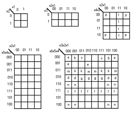 | Основные законы алгебры Буля Как уже отмечалось, в булевой алгебре все операции осуществляются с логическими переменными и подчиняются законам алгебры логики. Опишем некоторые из них. а) Переместительный закон а + в = в + а; ав = ва б) Сочетательный закон (а + в) + с = а + (в + с); (ав)с = а(вс) в) Распределительный закон а(в + с) = ав + ас; а + вс = (а + в)(а + с) г) Закон поглощения а + ав = а(1 + в) = а; а(a + в) = а + ав = а д) Закон склеивания ав + ав' = а; (а + в)(а + в') = а е) Идемпотентный закон a + a = a; a & a = a ё) Правила де Моргана Эти правила справедливы для любого числа аргументов. а + в + с + .... + z = ( а'в'с'...z' )' авс... = ( а' + в' + с' + ... + z' )' Эти правила можно описать таким алгоритмом. Для перехода от логической суммы к логическому произведению необходимо проделать следующие операции : проинвертировать все слагаемые в отдельности; заменить знаки дизъюнкции на знаки конъюнкции; проинвертировать получившееся выражение. Аналогично выполняется переход от логического произведения к логической сумме.В инженерной практике используются лишь правила де Моргана и закон склеивания(в виде карт Карно). Кроме основных функций И, ИЛИ, НЕ в алгебре логики часто используются функции равнозначности (эквивалентности) и неравнозначности (сумма по модулю 2 ). Для обозначения этих функций используются следующие знаки : равнозначность - ~ , сумма по модулю 2 - . Содержание этих функций отражено в таблице . a b f4 f5 0 0 1 0 0 1 0 1 1 0 0 1 1 1 1 0 Из таблицы получаем: f4 = а ~ в = а'в' + ав f5 = a в = а'в + ав' Из таблицы видно, что f4 = f5' или f5 = f4' Таким образом, а'в' + ав = ( ав' + а'в )' , или а~в = ( а в )' , а в = (а~в)' 1.3. Синтез комбинационных схем Синтез комбинационных схем можно проиллюстрировать решением простой задачи. Задача 1 Приёмная комиссия в составе трех членов комиссии и одного председателя решает судьбу абитуриента большинством голосов. В случае равного распределения голосов большинство определяется той группой, в которой оказался председатель приемной комиссии. Построить автомат, обеспечивающий определение большинства голосов. Решение Пусть f - функция большинства голосов. f = 1, если большинство членов комиссии проголосовало за приём абитуриента, и f = 0 в противном случае. Обозначим через x4 голос председателя комиссии. x4 = 1, если председатель комиссии проголосовал за приём абитуриента. x3, x2, x1 - голоса членов приёмной комиссии. С учётом вышеуказанных допущений условие задачи можно однозначно представить в виде таблицы истинности. Заполнение таблицы осуществляем с учётом того, что функция f является полностью определённой, т.е. она определена на всех возможных наборах переменных x1 - x4. Для n входных переменных существует N = 2n наборов переменных. В нашем примере N = 24 = 16 наборов. Записывать эти наборы можно в любом порядке, но лучше в порядке возрастания двоичного кода. x4 x3 x2 x1 f 0 0 0 0 0 0 0 0 1 0 0 0 1 0 0 0 0 1 1 0 0 1 0 0 0 0 1 0 1 0 0 1 1 0 0 0 1 1 1 1 1 0 0 0 0 1 0 0 1 1 1 0 1 0 1 1 0 1 1 1 1 1 0 0 1 1 1 0 1 1 1 1 1 0 1 1 1 1 1 1 1.4. Минимизация полностью определённых булевых функций. Существует несколько способов минимизации булевых функций. Прежде всего это метод Квайна-Мак-Класки, метод Блека-Порецкого и метод минимизации с помощью карт Карно или диаграмм Вейча [13, 22, 29]. Здесь будет подробно излагаться метод карт Карно, как самый удобный метод, позволяющий быстро решать задачи минимизации булевых функций от достаточно большого числа аргументов (6-12). При этом получается минимальная форма в базисе И