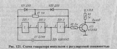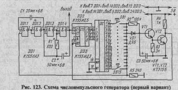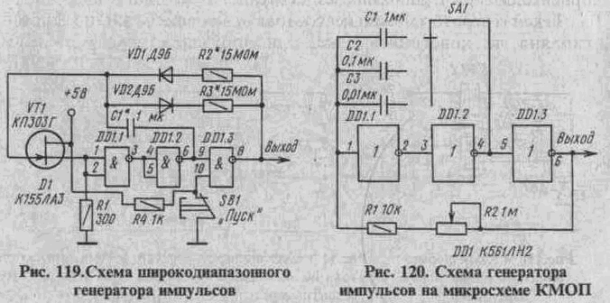| При наличии микросхемы КМОП (серия К176, К561) можно собрать широкодиапазонный генератор импульсов без применения полевого транзистора. Схема приведена на рис. 120. Для удобства установки частоты емкость конденсатора времязадающей цепи изменяют галетным переключателем SA1. Диапазон частот, формируемых генератором, составляет 1...10 000 Гц. На рис. 121 представлена схема генератора импульсов с регулируемой скважностью. Скважность, т. е. отношение периода следования импульсов к длительности напряжения высокого уровня на выходе логического элемента DD1.3, резистором R1 может изменяться от 1 до нескольких тысяч. При этом частота импульсов также незначительно изменяется. Транзистор VT1, работающий в ключевом режиме, усиливает импульсы по мощности. Генератор, схема которого приведена на рис. 122, вырабатывает импульсы как прямоугольной, так и пилообразной формы. -адающий генератор выполнен на логических элементах DD 1.1-DD1.3. На конденсаторе С2 и резисторе R2 собрана дифференцирующая цепь, благодаря которой на выходе логического элемента DD1.5 форми- руются короткие положительные импульсы (длительностью около 1 мкс). На полевом транзисторе VT2 и переменном резисторе R4 выполнен регулируемый стабилизатор тока. Этот ток заряжает конденсатор С3, и напряжение на нем линейно возрастает. В момент поступления на базу транзистора VT1 короткого положительного импульса транзистор VT1 открывается, разряжая конденсатор С-. На его обкладках таким образом формируется пилообразное напряжение. Резистором R4 регулируют ток зарядки конденсатора и, следовательно, крутизну нарастания пилообразного напряжения и его амплитуду. Конденсаторы С1 и С- подбирают исходя из требуемой частоты импульсов. Иногда возникает необходимость в построении генератора, который формирует число импульсов, соответствующее номеру нажатой кнопки. Принципиальная схема устройства (первый вариант), реализующего такую возможность, приведена на рис. 123. Функционально оно включает генератор импульсов, счетчик и дешифратор. Генератор прямоугольных импульсов собран на логических элементах DD1.3 и DD1.4. Частота следования импульсов около 10 Гц. С выхода генератора импульсы поступают на вход двоично-десятичного счетчика, выполненного на микросхеме DD2. Четыре выхода счетчика соединены со входами микросхемы DD3, представляющей собой дешифратор на 4 входа и 16 выходов. При подаче питающего напряжения на правых (по схеме) контактах всех пятнадцати кнопок SB I-SB 15 будет напряжение низкого уровня, обеспечиваемое наличием низкоомного резистора R5. Это напряжение подается на вход ждущего мультивибратора, выполненного на элементах DD1.1, DD1.2 и конденсаторе С1, и