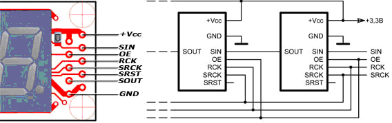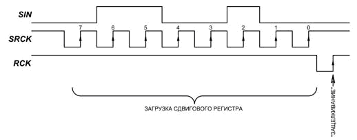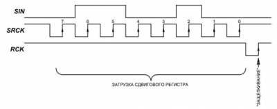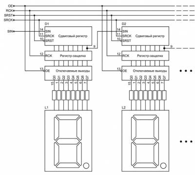 | 50 Статический светодиодный цифровой индикатор, управляемый по SPI Вывод на семисегментный светодиодный индикатор цифровой информации в схеме с микроконтроллером встречается часто, и разработчики таких схем выполняют его каждый по-своему. Ниже описан модуль индикации, который вполне может стать универсальным решением, что значительно упростит разработку новых устройств. На рис.1 представлена функциональная схема модуля. Каждым семисегментным индикатором управляет отдельная микросхема типа SN74HC595D, содержащая: • 8-разрядный сдвиговый регистр; • параллельный регистр-защелку; • управляемый выходной буфер. Рис.1. Функциональная схема универсального многоразрядного семисегментного светодиодного цифрового индикатора Последовательно загружаемые в сдвиговый регистр биты данных подаются на вход SIN (Serial Input). Их фиксация в сдвиговом регистре (стробирование) происходит по перепаду импульсного сигнала на входе SRCK из состояния логического "0" в лог. "1". Когда загрузка сдвигового регистра завершена, его состояние копирует и запоминает регистр-защелка. Происходит это по перепаду из лог. "0" в лог. "1" подаваемого на вход RCK специального импульса (см. рис.2). Но на выходы микросхемы Q0..Q7 состояние регистра-защелки поступит лишь при логическом "0" на входе OE (Output Enable). В противном случае (OE = лог. "1") выходы микросхемы отключаются (переходят в высокоимпедансное сосотояние) и индикатор гаснет. Подав лог. "0" на вход SRST можно сбросить в ноль сдвиговый регистр (но не регистр-защелку) независимо от сигналов SIN и SRCK. Последовательное соединение микросхем SN74HC595D в цепочку позволяет наращивать разрядность светодиодного семисегментного индикатора. Управляющие сигналы при этом остаются прежними, соответственно увеличивается лишь число загружаемых бит данных. На рис.3 приведена принципиальная электрическая схема такого модуля индикации на два знакоместа. Резисторы R1..R5 определяют состояние входных сигналов при отключении модуля от микроконтроллерной схемы и служат "нагрузкой" линий управления индикатором. Гасящие резисторы R6..R21 определяют ток каждого сегмента при его включении, который во всяком случае не должен превышать максимально допустимый для выходов микросхемы SN74HC595D (см. таблицу 1). Установка перемычки J1 на замыкание ее средней точки на общий провод GND или провод питания +Vcc позволяет использовать в схеме семисегментные светодиодные индикаторы как с общим катодом, так и с общим анодом. Конденсаторы C1..C3 предотвращают сбои от возможных внешних помех по питанию. Схема модуля индикации на два знакоместа