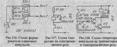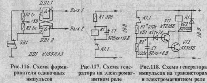 | Интегрирующая цепь. а - схема. б - токи и напряжения в схеме.| Получение пилообразного напряжения. а - схема. б - напряжения на входе невыходе. Если на вход такой цепи подается импульс напряжения прямоугольной формы ( рис. 11 - 34, 6), то напряжение на конденсаторе растет постепенно, стремясь к величине напряжения на входе. Для того чтобы нарастающее напряжение на конденсаторе не препятствовало прохождению тока в цепи, оно не должно возрастать за время импульса до величины, Си-измеримой с напряжением на входе. Это достигается включением последовательно в цепь весьма большого активного сопротивления, в результате чего постоянная времени цепи оказывается намного больше длительности импульса. Однако постоянная времени должна быть одновременно настолько малой, чтобы после окончания действия импульса конденсатор успел разрядиться до начала следующего импульса. В некоторых случаях ставится задача интегрирования серии импульсов, тогда постоянная времени соответственно увеличивается. Генераторы импульсов используют во многих радиотехнических устройствах (электронных счетчиках, реле времени), применяют при настройке цифровой техники. Диапазон частот таких генераторов может быть от единиц герц до многих мегагерц. На рис. 116 приведена схема генератора, который формирует одиночные импульсы прямоугольной формы при нажатии кнопки SB1. На логических элементах DD1.1 и DD1.2 собран RS-триггер, предотвращающий проникновение импульсов дребезга контактов кнопки на пересчетное устройство. В положении контактов кнопки SB1, показанном на схеме, на выходе 1 будет напряжение высокого уровня, на выходе 2 - напряжение низкого уровня; при нажатой кнопке - наоборот. Этот генератор удобно использовать при проверке работоспособности различных счетчиков. На рис. 117 показана схема простейшего генератора импульсов на электромагнитном реле. При подаче питания конденсатор С1 заряжается через резистор R1 и реле срабатывает, отключая источник питания контактами К 1.1. Но реле отпускает не сразу, поскольку некоторое время через его обмотку будет протекать ток за счет энергии, накопленной конденсатором С1. Когда контакты К 1.1 опять замкнутся, снова начнет заряжаться конденсатор - цикл повторяется. Частота переключении электромагнитного реле зависит от его параметров, а также номиналов конденсатора С1 и резистора R1. При использовании реле РЭС-15 (паспорт РС4.591.004) переключение происходит примерно один раз в секунду. Такой генератор можно использовать, например, для коммутации гирлянд на новогодней елке, для получения других световых эффектов. Его недостаток - необходимость использования конденсатора значительной емкости. На рис. 118 приведена схема еще одного генератора на электромагнитном реле, принцип работы которого аналогичен предыдущему генератору, но обеспечивает частоту импульсов 1 Гц при емкости конденсатора в 10 раз меньшей. При подаче питания конденсатор С1 заряжается через резистор R1. Спустя некоторое время откроется стабилитрон VD1 и сработает реле К1. Конденсатор начнет разряжаться через резистор R2 и входное сопротивление составного транзистора VT1VT2. Вскоре реле отпустит и начнется новый цикл работы генератора. Включение транзисторов VT1 и VT2 по схеме составного транзистора повышает входное сопротивление каскада. Реле К 1 может быть таким же, как и в преды