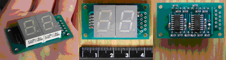 | Таблица 1. Некоторые технические характеристики микросхемы SN74HC595D Параметр Условия измерения Значение Uпит.,В - 2...6 Iпотр.,мкА - < 80 Uвых.лог."1",В Uпит. = 4,5В > 3,98 Iвых. = -6мА Tокр.ср. = 25oC Uвых.лог."0",В Uпит. = 4,5В < 0,26 Iвых. = 6мА Tокр.ср. = 25oC Cвх.,пФ - < 10 На рис.4 приведен внешний вид модуля индикации. Модуль разработан под применение светодиодных семисегментных индикаторов производства фирмы Kingbright серий SA05-11 (с общим анодом) или SC05-11 (с общим катодом) или им аналогичных с высотой знака 12,7 мм. В результате получился компактный модуль индикации, габаритные размеры которого не намного больше размеров самих индикаторов. Сделать это оказалось совсем не сложно, так как каждая микросхемаSN74HC595D в корпусе SOIC-16 вполне умещается под "своим" индикатором с другой стороны двухсторонней печатной платы. Соответствие выходов микросхем и сегментов индикатора выбрано исходя из простоты трассировки печатных проводников на плате модуля. Также под поверхностный монтаж применены резисторы и конденсаторы типоразмером 0805. Габаритные размеры печатной платы 43,2 x 22,9 мм. Ее чертеж и установка на ней элементов приведены на рис.5. С одной стороны платы устанавливаются светодиодные семисегментные индикаторы L1 и L2, резисторы R1..R5 и конденсатор C1, а с другой - все остальные елементы: микросхемы D1 и D2, гасящие резисторыR6..R21, конденсаторы C2 и C3, а также запаивается перемычка J1. Светодиодный семисегментный индикатор на два знакоместа Модуль работает при напряжении питания от +2,8 В до +5,5 В. Значение напряжения питания и тип индикаторов определяют и требуемое сопротивление гасящих резисторов R6..R21 исходя из тока одного сегмента в пределах 4...4,5 мА (см. таблицу 2). Таблица 2. Номиналы гасящих резисторов R6..R21 Цвет Напряжение питания +3,3В +4,5В +5,0В Красный 360 Ом 620 Ом 750 Ом Желтый 330 Ом 620 Ом 750 Ом Зеленый 300 Ом 560 Ом 680 Ом