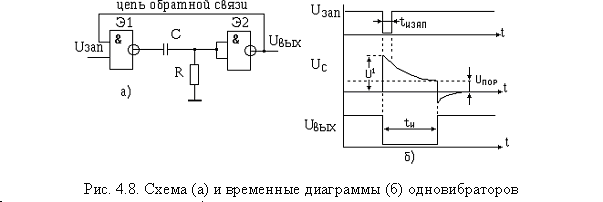 | 44 Одновибраторы предназначены для вырабатывания одиночных импульсов с заданной длительностью. При этом длительность запускающего импульса особой роли не играет, лишь бы она была не больше длительности вырабатываемого одновибратором импульса, т.е. tи зап<tи, где tи зап - длительность запускающего импульса; tи - длительность выходного импульса одновибратора. Схема одновибратора приведена на рис. 4.8, а. Он выполнен на двух элементах логики типа 2И-НЕ путем введения положительной обратной связи (выход второго элемента соединен с входом первого). В исходном состоянии на выходе элемента Э2 имеется уровень “1”, а на выходе элемента Э1- “0”, так как на обоих его входах имеется “1”(запускающие импульсы представляют отрицательный перепад напряжения). При поступлении на вход запускающего отрицательного перепада напряжения на выходе первого элемента появится уровень “1”, т.е. положительный скачок, который через конденсатор С поступит на вход второго элемента. Элемент Э2 инвертирует этот сигнал и уровень “0” по цепи обратной связи подается на второй вход элемента Э1. На выходе элемента Э2 поддерживается уровень “0” до тех пор, пока не зарядится конденсатор С до уровня Uc пор = U1 - Uпор, а напряжение на резисторе R не достигнет порогового уровня Uпор (рис. 4.8, б). Длительность выходного импульса одновибратора может быть определена с помощью выражения tи = C(R+Rвых)ln* Uстеп1/Uпор, где Rвых - выходное сопротивление первого элемента. Uпор - пороговое напряжение логического элемента.