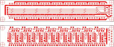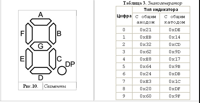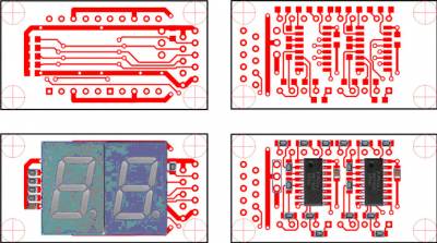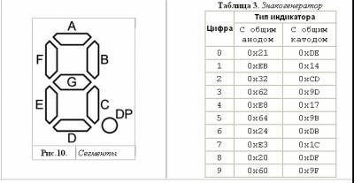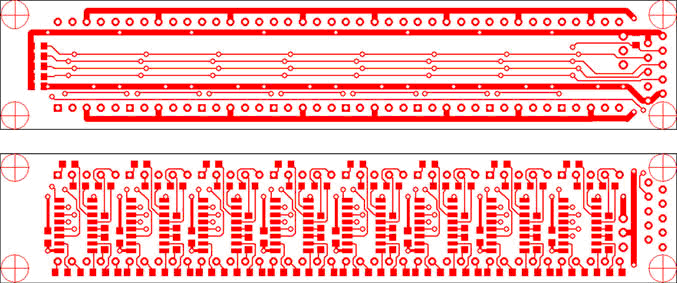 | Соответствие сегментов индикатора обозначениям на схеме приведено на рис.10. Если последовательная загрузка очередного байта через порт SPI начинается со старшего бита, то соответствующие десятичным цифрам шестнадцатиричные коды для загрузки будут такими как втаблице 3. Для включения десятичной точки (сегмент DP) перед загрузкой байта с ним следует выполнить логическую операцию "ИЛИ" с шестнадцатиричным числом 0x20 для индикатора с общим катодом или логическую операцию "И" с шестнадцатиричным числом 0xDF для индикатора с общим анодом. Радиолюбители, конструирующие, например, радиоприемные устройства с цифровой шкалой, могут отметить для себя еще одно важное преимущество такого модуля индикации - предельно низкий уровень создаваемых радиопомех. Ведь в отличие от схем с динамической индикацией необходимость в управляющих импульсах на длинных проводниках появляется здесь лишь для обновления выводимого на индикатор числового значения. В промежутках между такими обновлениями, когда индикатор лишь отображает число в соответствии с последней загрузкой, то есть львиную долю времени, какие-либо импульсы на схему вообще не подаются - индикация статическая и радиопомех нет. На рис.11 приведена трассировка печатной платы для 8-разрядного светодиодного семисегментного модуля индикации по такой же схеме. Легко заметить "регулярность" рисунка печатной платы, аппликацией фрагментов которого можно создать рисунок для модуля индикации требуемой разрядности уже под свои нужды. Похожим образом можно создавать модули со светодиодными индикаторами большего размера, требующими как более высокого тока одного сегмента, так и напряжения на нем. Для этой цели можно взять, например, такую микросхему как TPIC6595 производства фирмы Texas Instruments. Работает она так же, как SN74HC595D, но ее выходы на основе мощных полевых транзисторов с открытым стоком имеют нагрузочную способность 250 мА при максимально допустимом напряжении45 В. Микросхему SN74HC595D можно заменить аналогичной других производителей, например74HC595D производства ON Semiconductor или NXP Semiconductor (бывшая Philips Semiconductor). Эта микросхема вполне доступна и стоит недорого. Цифровые семисегментные светодиодные индикаторы SA05-11 или SC05-11 можно также заменить на аналогичные других производителей. Вполне подойдут, например, индикаторы BS-A532RI, BS-C532RI или другие серии BS-x53xRxпроизводства фирмы Bright LED Electronics Corp. Применить можно и другие индикаторы, но это, естественно, повлечет за собой разработку новой печатной платы, что, впрочем, вполне по силам большинству инженеров и радиолюбителей.