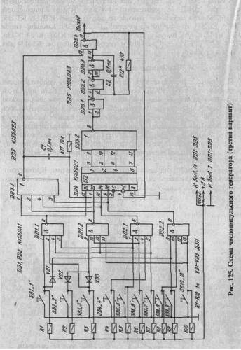 | гасящего импульсы дребезга контактов кнопок. На выходе ждущего мультивибратора - напряжение низкого уровня, поэтому генератор импульсов не работает. При нажатии одной из кнопок конденсатор С3 мгновенно заряжается через диод VD1 до напряжения высокого уровня, в результате чего на выводах 2 и 3 счетчика DD2 появляется напряжение низкого уровня, устанавливающее его в рабочее состояние. Одновременно через замкнутый контакт нажатой кнопки напряжение высокого уровня подается на вход ждущего мультивибратора, и импульсы генератора поступают на вход счетчика. При этом на выходах дешифратора последовательно появляется напряжение низкого уровня. Как только оно появится на выходе, с которым соединен контакт нажатой кнопки, подача импульсов на вход счетчика прекратится. С вывода 11 элемента DD1.4 будет снято число импульсов, соответствующее номеру нажатой кнопки. Если продолжать удерживать кнопку нажатой, то через некоторое время конденсатор С- разрядится через резистор R2, счетчик DD2 установится в нулевое состояние и генератор выдаст новую серию импульсов. До окончания серии импульсов кнопку отпускать нельзя. В устройстве использованы резисторы МЛТ-0,25; оксидные конденсаторы - К50-6. Транзисторы VT1, VT2 могут быть серий КТ312, КТ315, КТ503, КТ201, диод VD1 - серий Д7, Д9, Д311. Кнопки SB 1 -SB 15 - типов П2К, KM 1-1 и др. Настройка числоимпульсного генератора заключается в установке подбором резистора R1 и конденсатора С2 требуемой частоты следования импульсов генератора, которая может быть в пределах от единиц герц до десятков килогерц. При частоте выше 100 Гц для выдачи полной серии импульсов требуется время не более 0,15 с, поэтому кнопку можно не удерживать пальцем - короткого нажатия ее вполне достаточно для формирования пачки импульсов. На рис. 124 представлена схема еще одного числоимпульсного генератора (второй вариант), по принципу работы аналогичного описанному выше. Благодаря применению микросхем серии К176 схема генератора упростилась. Генератор формирует от 1 до 9 импульсов. В двух описанных выше вариантах числоимпульсных генераторов необходимо удерживать кнопку нажатой до окончания серии импульсов, в противном случае на выход поступит неполная пачка импульсов. Это является недостатком. На рис. 125 приведена схема третьего варианта числоимпульсного генератора, в котором импульсы начинают вырабатываться после отпускания кнопки. На микросхемах DD1, DD2 и диодах VD1-VD3 собран шифратор, преобразующий десятичное число в двоичный код. Сигналы с выходов шифратора подаются на входы D1, D2, D4, D8 микросхемы DD4 (реверсивный счетчик) и на входы логического элемента 4ИЛИ-HE(DD3.1). Рассмотрим работу генератора при нажатии кнопки SB3. Когда кнопка нажата, на выходах логических элементов DD1.1 и DD1.2 установится напряжение высокого уровня, а на выходах DD2.1, DD2.2 сохранится напряжение низкого уровня. На выходе логического элемента DD3.1 появится напряжение низкого уровня, которое через дифференцирующую цепь C1R11 поступит на вход С реверсивного счетчика DD4 и установит его в состояние 1100. При этом на выходе логического элемента DD3.2 установится напряжение низкого уровня, которое инвертируется логическим элементом DD5.1 и подготавливает к работе генератор на логических элементах DD5.2-DD5.4. После отпускания кнопки SB3 на выходе элемента DD3.1 появится напряжение высокого уровня, которое будет подано 
